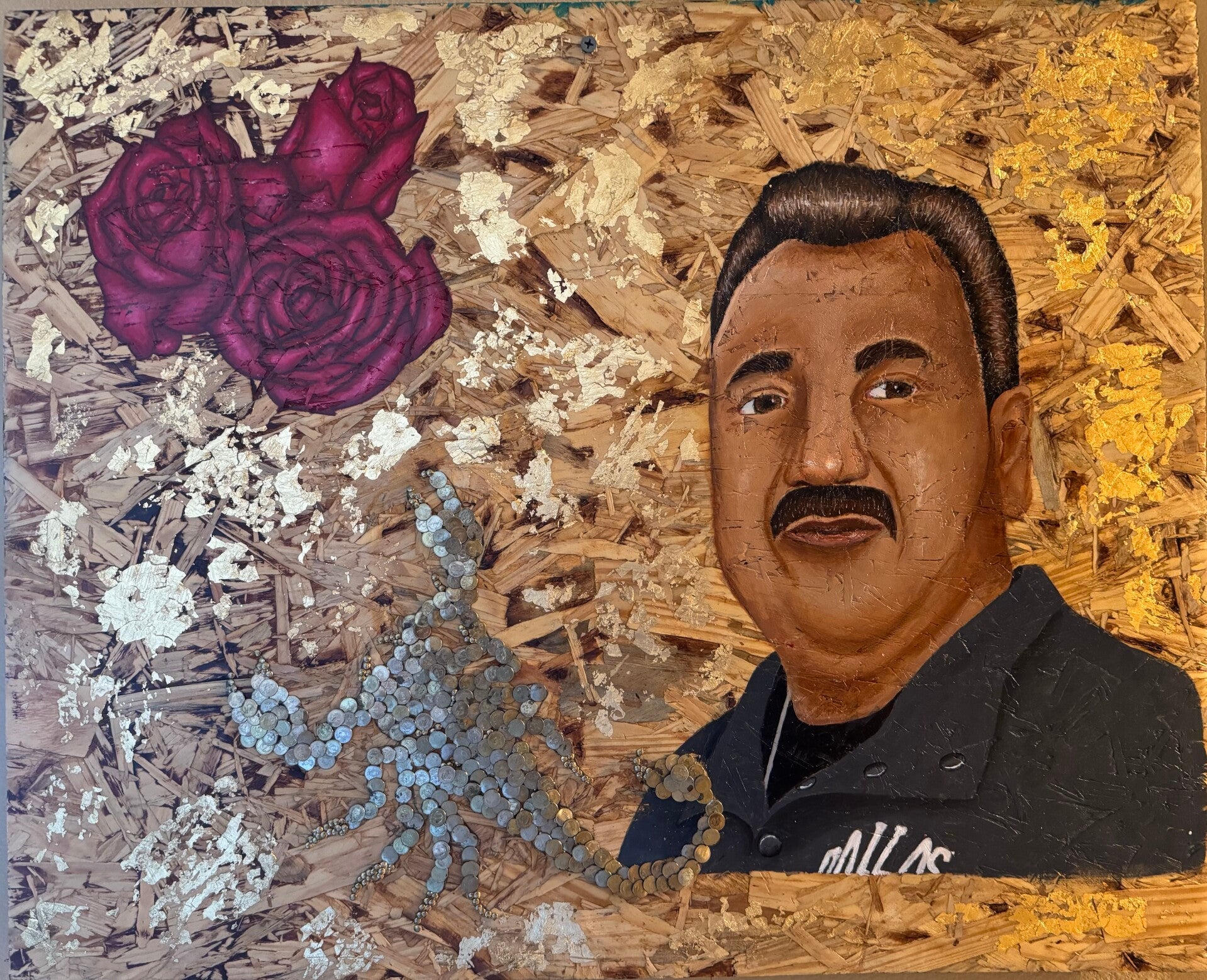 This art piece was a portrait of my father who passed away in January of 2022. Beside him are items that correlate to his personality and things he enjoyed. The Scorpion made with nails has a double meaning, where the scorpion represents my father's zodiac sign and the nails represents his occupation as a construction worker. The roses are from a memory of mine that I adore. This memory is when my father was working out of state, and he still managed to give my mother a big vase of roses for valentine's days to show how much he loved her. However, since I was a beginner the portrait itself does not look like my father at all, so I like to make a joke out of it and call him Al.